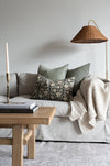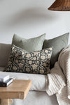Introducing GRETA, a new botanical block print featuring a floral motif on a muted green linen with a rustic quality and texture. This eye-catching design stands out in any space, adding both the typical charm of a cottage and a touch of handcrafted artistry. Hand-printed in India, this textile is truly unique and representative of centuries of tradition and craftsmanship.